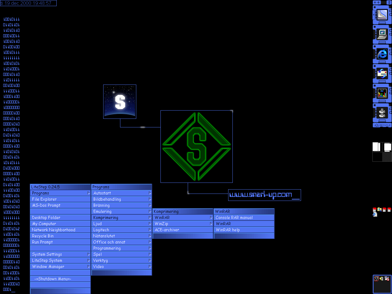 My Step ...Thought I'd write a bit more on LiteStep to try and encourage people to try it and give an idea of its possibilities. So, this page is all about my own LiteStep theme (or maybe even themes, in time ...) and what goes on behind its surface. To make things easier to understand, click here to get a screenshot (58 Kb gif picture) in a new window (it's 1280 by 960 so it doesn't really fit into my frames :-). And remember, none of the things I've got on my desktops have to be there, or have to look the way they do! Virtually anything can change looks with LiteStep! Notes on different parts follow ... The WharfRight, the wharf is the bunch of icons on the top right side of the screen. The top one hides a menu for reaching a few key parts of LiteStep, like step.rc and so. Reaching step.rc is the only thing I use it for really, so maybe I should turn it into a standard button just for that ... Then there are the buttons to start Explorer, IE, Outlook and Tetris, of which the Tetris button sees the least use. The last button is one to toggle the console in the upper left corner of the screen, also a pretty seldom-used button. Finally, there's the bottom tile of the wharf, configured to recycle LiteStep when clicked. Recycling is the way to make changes in step.rc take effect, so it's always good to have an extra button for it lying around ...